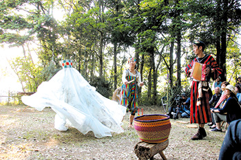 「舞台の東にある杉の巨木、西南北に配置した自作の木の彫刻、竹と草花で作った緞帳と森全体が舞台のセット。普段は見えないけれど見たいと思えば見えてくるもの、それが森に潜む精霊です」とユカリウムさん。「地元に住んでいるけれど、こんな素敵な森があるなんて知りませんでした」との声が多く聞かれた。森の中ではゆったりとした時間が流れ、大人も子どもも思い思いにまつりを楽しんだ。