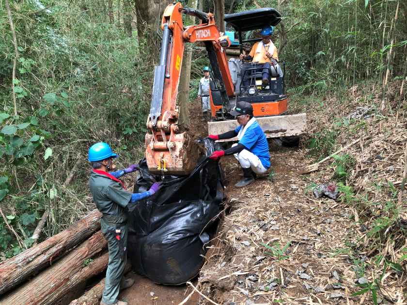 CITYLIFE 地域情報紙シティライフ のみがね峻道に新ルート『こもれびの道』~野見金公園にて全線開通完成祭~【長南町】 2025.10.02 【写真】完成したこもれびの道 長南町の野見金山を走るトレッキングロード『のみがね峻道』。2022年7月、野見金公園から野見金山中腹にある浅間神社の参道入口・堰谷までと、途中コースが枝分かれした不動の滝までの、全長1・4㎞が開通した。地元水沼地区の住民有志による『のみがね会』が、倒木や硬い岩盤と格闘し、約5年かけて造り上げた。それから3年を経て、1・3㎞の新ルート『こもれびの道』が今秋開通した。のみがね会会長の広田元一さんは、「これまでの『山の道』を終点まで行くと、帰りは同じ道か、麓のアスファルトの車道を歩いていました。みなさんのご要望もあり、谷津田へと下るルートを完成させ、ぐるっと周遊できるようになりました」と、説明する。例えば公園を起点に山の道を行き、堰谷からこもれびの道へ入り、不動の滝で再び山の道に合流して公園まで戻ると、歩行距離は約3㎞で、ゆっくり歩いて90分ほどの道のりだ。 峻道の名の通り、地形を活かした急な斜面やロープを頼りに伝う狭い尾根もある山の道だが、こもれびの道は谷津田が広がる里山の趣で、比較的歩きやすい道が続く。工事では、水沼地区で古くから山仕事の作業道として利用されてきた道を整備し、車道との高低差20mの崖地に階段を造成した。山の道とこもれびの道には、それぞれトイレは1カ所ずつ。休憩用のベンチや杖も設置されている。「きびしい坂がありますが、遠くに海を望んだり、ゴルフ場の脇を通ったりと、面白いコースです。空気もおいしいし、健康な体作りに役立ててもらいたい」と、広田さん。同会参与の古市仲司さんは、「コースは四季折々に違う表情を見せます。一年を通して季節の変化を楽しみながら歩いて、足腰を丈夫に保っていただきたい」と、話している。 こもれびの道の造成作業(左) のみがね峻道入口とパネル 10月19日(日)には、『のみがね峻道全線開通完成祭』が野見金公園で開催される。11時半からの記念式典に先立ち、当日9時半~11時の予定で『のみがね峻道ウオーキング・ガイド付き』が行われる。のみがね会メンバーの案内で、造成の苦労話など聞きながら峻道を歩く。参加費は1名500円で定員20名、受付は9時から。会場広場では12時頃より、のみがね会提供の『イノシシのバンザイ焼き』『ボタン汁』や、カレーやカフェなど出店多数。和太鼓演奏、竹を使ったワークショップ、丸太引き競争とイベントも盛り沢山。体を動かしながら、おいしい空気とグルメを味わいにお出かけになってはいかがだろう。峻道を歩くには山歩きに適した服装を。詳しくは問合せを。 問合せ:のみがね会 古市さん Tel.080・5066・5060 のみがね会メンバー