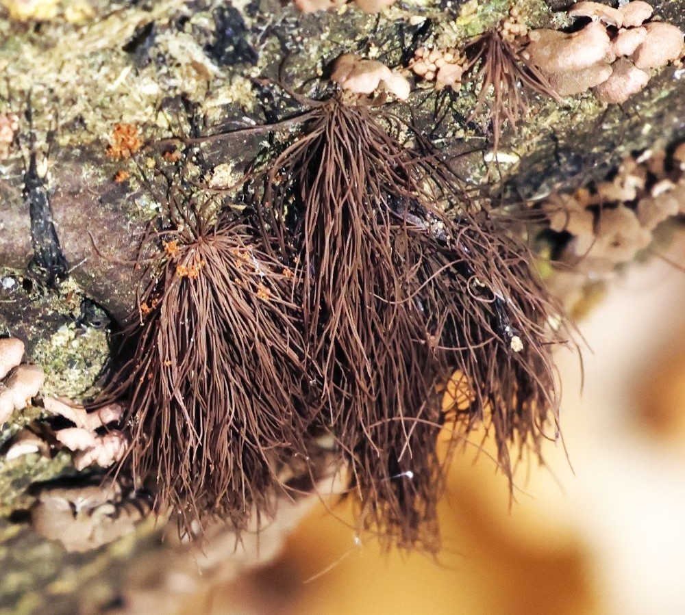 CITYLIFE 地域情報紙シティライフ ふるさとビジター館 自然探訪~千葉県で初記録!ムラサキヤマンバ~ 2025.12.18 今年の6月、県南のモミ林を歩いていると、ふと樹皮にキノコが出ているのに気づきました。それは爪くらいの小さなキノコで、髪のような毛の束が一緒に出ていました。キノコの形をしたほうは短い柄があって、裏は粗くくっきりとした襞があります。一方の毛の束のようなものは変形菌のオオムラサキホコリに似ていますが、良く見ると違います。こうした2つの形を呈する1種類のキノコというものがあるので、これもそうかな?と写真を撮りました。 博物館に問い合わせると「珍しいムラサキヤマンバ(キシメジ科)かもしれないので標本が欲しい」とのこと。あわてて山へ採取に行き、博物館に標本を送ると、なんと千葉県での発生記録は初とのことでした。現在見つかっているのは、基産地の高尾山の他では、神奈川、長野、山口、筑波山の4カ所のみとのことで、とても珍しいキノコです。 毛のようなものは根状菌糸束と言って、顕微鏡で見るとキノコの形をしているほうの柄の組織とほぼ同じものだとのこと。やはりこの2つのキノコは同じものなんですね。それにしても紫山姥とはすごい名前を付けたものです。なんだか木の中から妖怪が出てきそうな気がしますね!(ナチュラリストネット/加藤恵美子) ◇ナチュラリストネット/自然を愛する仲間の集まりです。豊かな自然環境をいつまでも永く残したいと活動しています。 ◇加藤恵美子ブログ 千葉県の自然見~つけた♪ https://emikocho.blog.fc2.com/