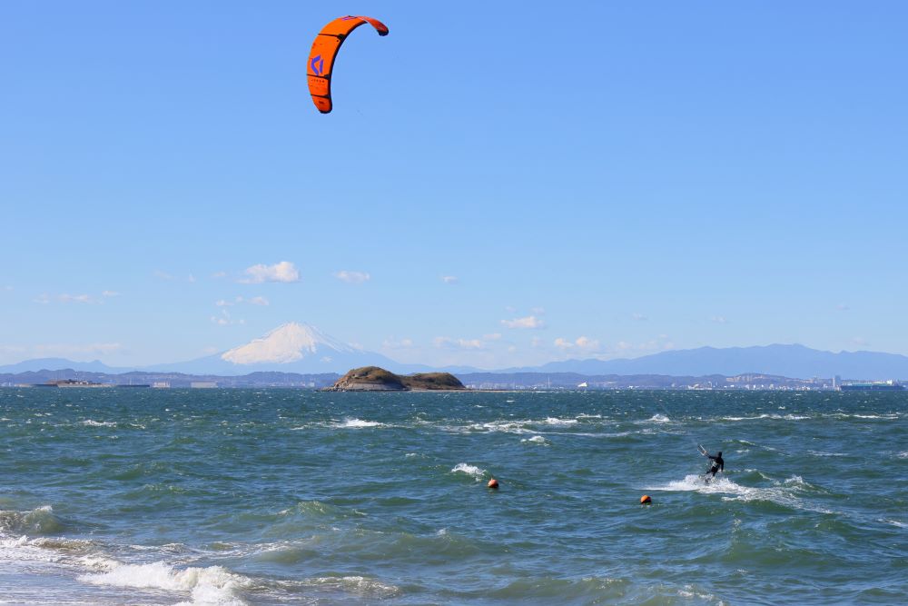 冷たい北風が吹くこの季節は、カイトサーフィンに最適な風が安定して吹き、愛好者たちにとっては絶好のシーズン。冬ならではの透明感ある光と空気が、海と空と富士の輪郭をくっきりと浮かび上がらせ、まさに絵画のような光景が広がります。寒さを忘れさせるほどの爽快な風景に、心も軽やかに舞い上がるようでした。