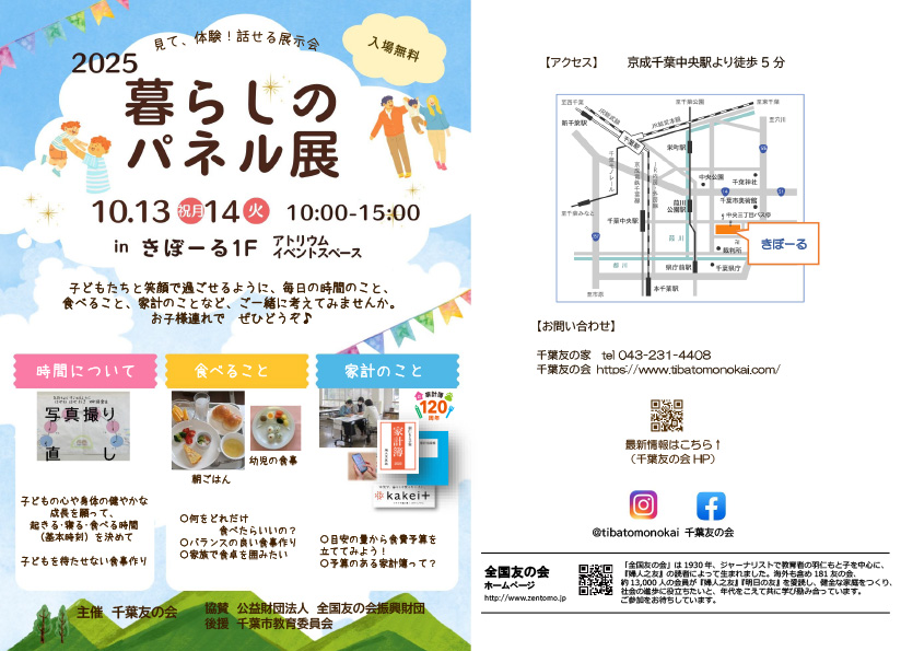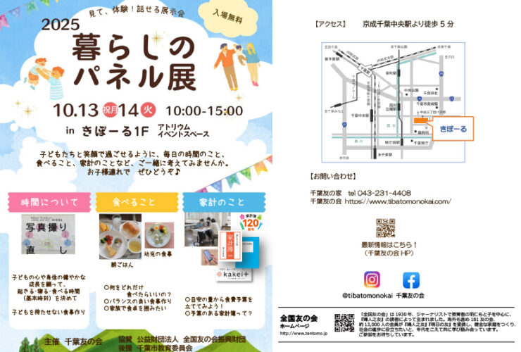 10月142025 『2025暮らしのパネル展』~子どもと共に育ち合う時に~ 10/13・14 10月13日(月祝)・14日(火) 千葉市中央区 きぼーる1階アトリウムイベントスペースにて『2025暮らしのパネル展』を開催します。 子育てのときに大切にしたい、時間や食事、家計のことなど、ご一緒に考えてみませんか。皆様のお越しをお待ちしています。 日程2025-10-13~10-14 時間10:00~15:00 場所千葉市中央区 中央4-5-1 きぼーる1Fアトリウムイベントスペース 地図 イベント名『2025暮らしのパネル展』~子どもと共に育ち合う時に~ 主催者名千葉友の会 参加費無料 関連サイトURLhttps://www.tibatomonokai.com/ 駐車場有り お問合わせ先 電話番号043-231-4408 メールアドレスtibatomonokai@nifty.com 備考※イベントの開催情報などは変更になる場合がありますので、事前にご確認の上お出掛けください。