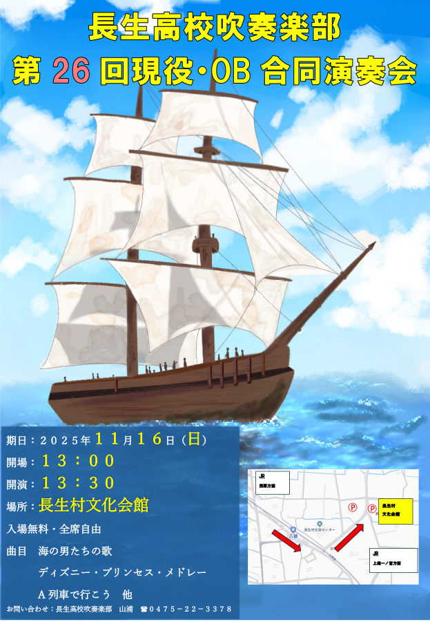 11月162025 長生高校吹奏楽部 第26回現役・OB合同演奏会 現役部員とOBによる吹奏楽の演奏会です。普段、少人数の部員だけでは出来ない大編成での演奏をOBとともに行います。 様々なジャンルの曲をお楽しみいただけます。せひご来場ください。 日程2025-11-16 時間13:00~15:40 場所長生郡長生村 岩沼2119 長生村文化会館 地図 イベント名長生高校吹奏楽部 第26回現役・OB合同演奏会 主催者名千葉県立長生高等学校吹奏楽部 参加費無料 駐車場有り お問合わせ先 電話番号0475-22-3378 メールアドレスheal036@docomo.ne.jp 備考※イベントの開催情報などは変更になる場合がありますので、事前にご確認の上お出掛けください。