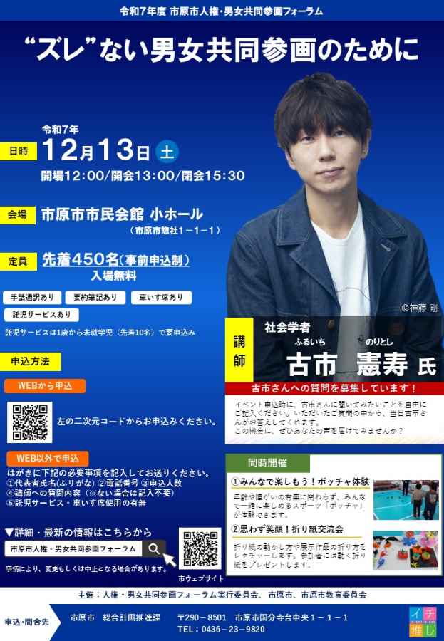 12月132025 市原市人権・男女共同参画フォーラム 「市民誰もが、人権が尊重され、性別に関わりなく、社会の中でその個性と能力を十分に発揮でき、自分らしく生き生きと暮らしていけるいちはら」を実現するため、人権及び男女共同参画に関するフォーラムを開催します。 今年度は、テレビや書籍でも活躍中の古市憲寿氏(社会学者)を講師にお招きし、「“ズレ”ない男女共同参画のために」をテーマに、ジェンダーに対する人々の意識についての現状を考察するとともに、ジェンダー平等を推進するために必要な視点やポイントについて講演いただきます。 また、小中学生から参加できる「誰でも楽しめるボッチャ体験」や「思わず笑顔!折り紙交流会」を同時開催します。皆様方のご参加をお待ちしております。 1 プログラム (1)第一部 ①小・中学生人権ポスター表彰 ②中学生人権作文発表 (2)第二部 古市憲寿氏による講演 テーマ:「“ズレ”ない男女共同参画のために」 2 定員 450名(事前申込・先着順) 3 申込方法 市ウェブサイトの申込フォーム又は、はがきに次の必要事項を記載し、お申し込みください。 (1)代表者氏名(ふりがな) (2)電話番号 (3)申込人数 (4)講師への質問内容(※ない場合は記入不要) (5)託児サービス、車いす席の利用有無 ※託児サービスの対象:1歳から未就学児まで(先着10名) 【宛先】 〒290-8501 市原市国分寺台中央1丁目1番地1 市原市役所 総合計画推進課 フォーラム担当 4 申込期限 定員になり次第締切 5 ワークショップについて 小・中学生から参加できる「誰でも楽しめるボッチャ体験」や「思わず笑顔!折り紙交流会」の申込方法や詳細は、市ウェブサイトをご覧ください。 日程2025-12-13 時間13:00~15:30 場所市原市惣社1-1-1 市原市市民会館 小ホール 地図 イベント名市原市人権・男女共同参画フォーラム 主催者名人権・男女共同参画フォーラム実行委員会、市原市、市原市教育委員会 参加費無料 関連サイトURLhttps://www.city.ichihara.chiba.jp/article?articleId=64dd7d7daa75bf56274a94c8 駐車場有り お問合わせ先 電話番号0436-23-9820 メールアドレスsoukei@city.ichihara.lg.jp 備考※イベントの開催情報などは変更になる場合がありますので、事前にご確認の上お出掛けください。