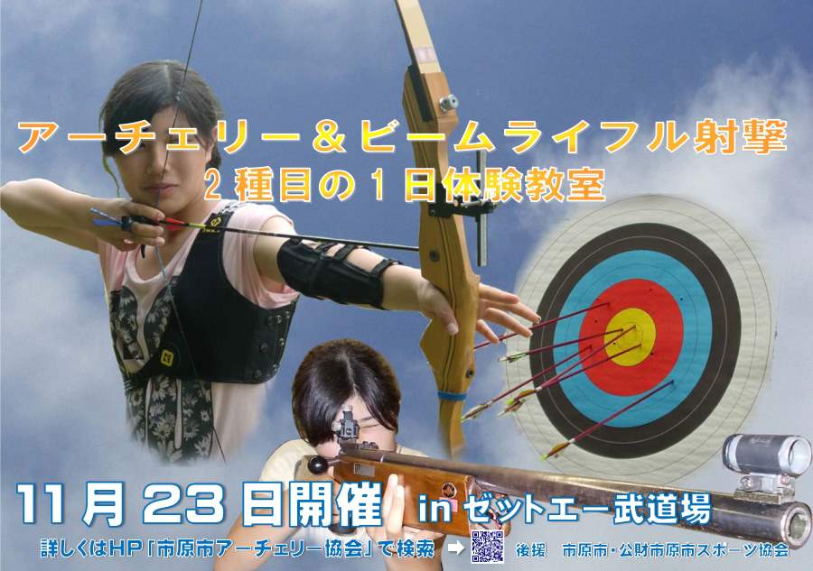 11月232025 アーチェリー&ビームライフル射撃1日体験教室 アーチェリーとビームライフル射撃の2種目を1日で体験できる日本で唯一の複合スポーツ教室です。 基礎から実技そして2種目の合計点を競うゲームまで行います。 ビームライフル銃はエアーライフル銃の弾のかわりにレーザービームを発射する銃です。 どなたでも体験できますが、対象年齢は10歳以上の方です。 日程2025-11-23 時間9:15~15:00 場所市原市 能満1474-1 ゼットエ―武道場 地図 イベント名アーチェリー&ビームライフル射撃1日体験教室 主催者名市原市アーチェリー協会 参加費1200円 関連サイトURLhttp://iaa.sports.coocan.jp/ 駐車場有り お問合わせ先 電話番号08054326155 メールアドレスbzl03611@nifty.com 備考※イベントの開催情報などは変更になる場合がありますので、事前にご確認の上お出掛けください。