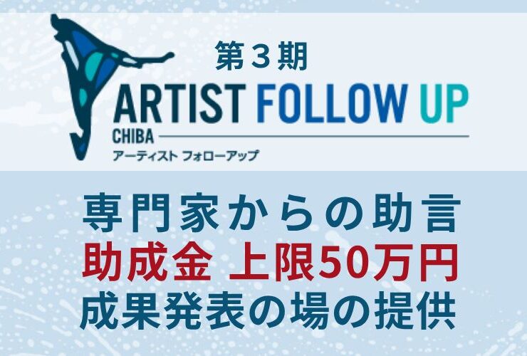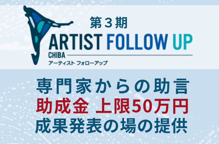 12月152025 アーティスト・フォローアップ事業・第3期支援対象者募集中 12/15まで ★千葉県 第3期アーティスト・フォローアップ事業 (申請受付 2025年11月1日~12月15日必着) ============================================== 先見性や斬新な発想をもち、優れた文化芸術活動を行う若手アーティストに、専門家の助言支援や活動経費の一部が助成です。 募集内容は美術(平面・立体)、デザイン、軽音楽、コンテンポラリーダンスの4分野の創作活動で、対象者は千葉県出身、在住、在学、在勤又は千葉県内を活動拠点とする方、本事業の支援を受けて実施する活動の内容や場所に千葉県との関わりがある39歳以下の個人またはグループです。 ▼ 詳細は千葉県文化振興財団(アーティスト・フォローアップ事業)のウェブサイトをご覧ください https://www.cbs.or.jp/artist-f/ 日程12月15日まで 場所千葉市中央区 市場町11-2 千葉県文化会館 地図 イベント名アーティスト・フォローアップ事業・第3期支援対象者募集 主催者名千葉県、公益財団法人千葉県文化振興財団 参加費無料 関連サイトURLhttps://www.cbs.or.jp/artist-f/ 駐車場無し お問合わせ先 電話番号043-222-0077 メールアドレスartist-f@cbs.or.jp 備考※イベントの開催情報などは変更になる場合がありますので、事前にご確認の上お出掛けください。