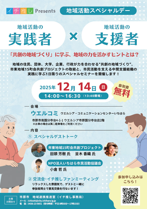 11月302025 イチ推しPresents 地域活動スペシャルデー 地域の住民、団体、大学、企業、行政が力を合わせる”共創の地域づくり”。スペシャルゲスト(実践者・支援者)の経験談から学ぶ1日限りの「地域活動スペシャルデー」を開催します! 【内容】 第1部 14:00~14:15 開会・主催者挨拶・地域共創プロジェクト概要説明等 地域連携推進室の担当職員から、地域共創プロジェクトの概要や団体の活動内容、今後の展開について、説明をします。 14:15~15:25 スペシャルゲスト・トーク 15:25~15:40 記念撮影・休憩 第2部 15:40~16:30 交流会・イチ推しファンミーティング ゲストごとにブースを作り、参加者との交流を深める交流会を開催します。また、交流会と同時開催で、イチ推し団体参加者が、イチ推し活用に関する悩みを共有し、一緒に悩みの解消に向けて考えるイチ推しファンミーティングを開催します。 【定員】先着70名 【対象者】地域活動に興味のある方、地域活動をこれから始めたい方、市民活動の幅を広げたい方 【申込方法】市ウェブサイトの申込フォームからお申し込みください。 日程2025-12-14 時間14:00~16:30 場所市原市 南国分寺台4丁目1?1 ウエルシア市原国分寺台店 2階 地図 イベント名イチ推しPresents 地域活動スペシャルデー 主催者名市原市地域連携推進室 参加費無料 関連サイトURLhttps://www.city.ichihara.chiba.jp/article?articleId=665fcee91c88c958518fef9a 駐車場有り お問合わせ先 電話番号0436-23-9851 メールアドレスsiminkatudou-support@city.ichihara.lg.jp 備考※イベントの開催情報などは変更になる場合がありますので、事前にご確認の上お出掛けください。