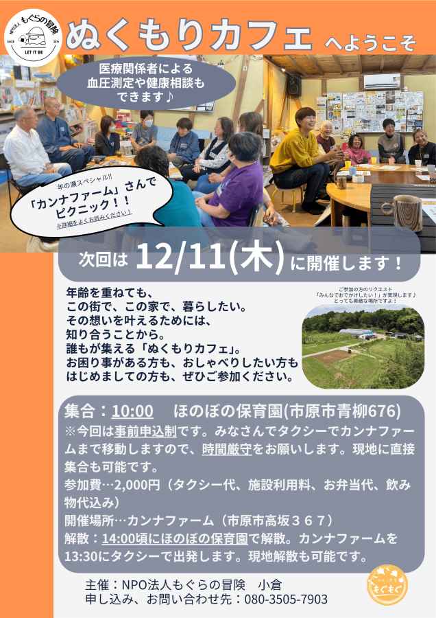 12月112025 ぬくもりカフェ 年齢を重ねても、この街で、この家で、暮らしたい。 その想いを叶えるためには、まずは出会い、知り合うことからです。 シニア世代の方々も、お困り事がある方も、おしゃべりしたい方も、はじめましての方も、ぜひご参加ください。 今回は、ご参加の方のリクエストで、ピクニックに出かけます!タクシー乗り合わせの都合上、事前にご予約ください。 楽しくおしゃべりしながら、一緒に過ごしましょう♪ 日程2025-12-11 時間10:00~13:30 場所市原市 高坂367 カンナファーム 地図 イベント名ぬくもりカフェ 主催者名NPO法人もぐらの冒険 参加費2000円 関連サイトURLhttps://www.instagram.com/mogmog.oyako/ 駐車場有り お問合わせ先 電話番号08035057903 メールアドレスmogumogu.kurashinoba@gmail.com 備考※イベントの開催情報などは変更になる場合がありますので、事前にご確認の上お出掛けください。