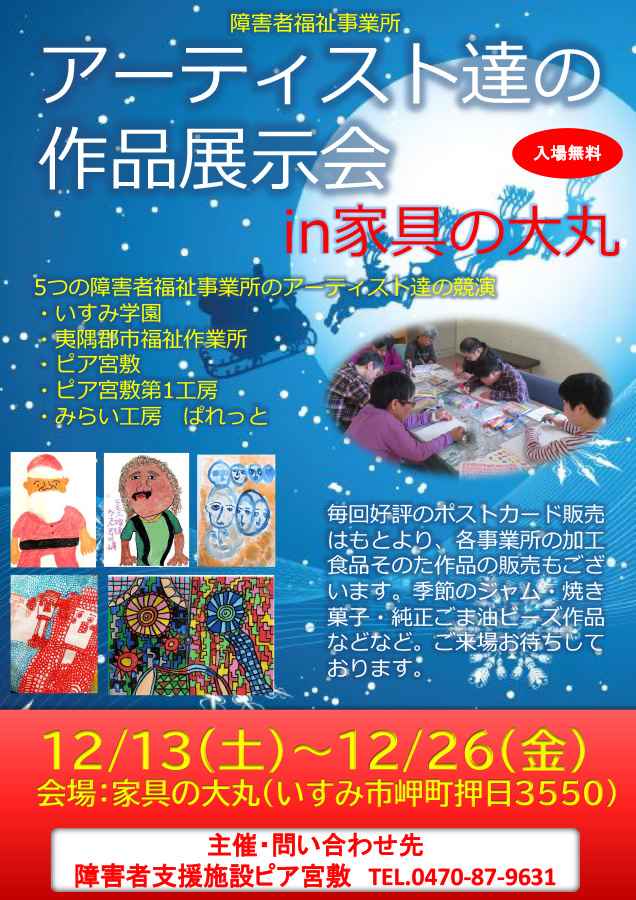 12月132025 アーティスト達の作品展示会2025 5つの障害者福祉事業所のアーティスト達の競演です。 素敵なアート作品のほかにも、毎回好評のポストカード、各事業所の季節のジャム・焼き菓子・純正ごま油などなど。 皆様のご来場お待ちしております。 日程2025-12-13~12-26 時間10:00~15:00 場所いすみ市 岬町岩熊 3550 家具の大丸 特設会場 地図 イベント名アーティスト達の作品展示会2025 主催者名社会福祉法人 土穂会 参加費無料 関連サイトURLhttp://piamiyasiki.jp/ 駐車場有り お問合わせ先 電話番号0470879631 メールアドレスmiyasiki@bz01.plala.or.jp 備考※イベントの開催情報などは変更になる場合がありますので、事前にご確認の上お出掛けください。