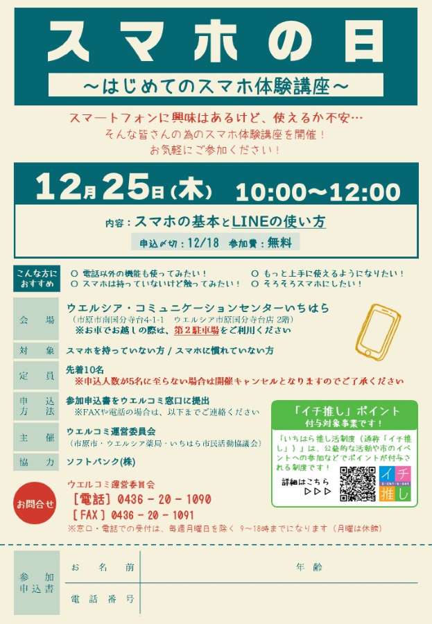 12月252025 気軽にスマホ体験!「スマホ体験講座」 12/18〆切 スマホに興味はあるけど、自分に使えるか心配で購入をためらっている方、スマホは持っているけど電話以外の機能は使ったことが無い方向けのスマホ教室です。 1人1台準備されたスマホで、インストラクターが丁寧に説明しながら実際に操作を行います。 テーマ:スマホの基本とLINEの使い方 申込方法:12月18日(木)までに電話(ウエルコミ:0436-20-1090) ウエルコミ窓口又はFAX(0436-20-1091)で申込み ※ウエルコミ開館時間 9:00~18:00 (月曜休館) 車でお越しの際は第2駐車場をご利用ください。 日程2025-12-25 時間10:00~12:00 場所市原市 南国分寺台 4-1-1 ウエルシア・コミュニケーションセンターいちはら(通称:ウエルコミ) ウエルシア市原国分寺台店2階 地図 イベント名気軽にスマホ体験!「スマホ体験講座」 主催者名ウエルコミ(市原市・ウエルシア薬局・いちはら市民活動協議会) 参加費無料 関連サイトURLhttps://ichihara-machisapo.jp/0266/event/124.php 駐車場有り お問合わせ先 電話番号0436-20-1090 メールアドレスwelcommu.ichihara@gmail.com 備考※イベントの開催情報などは変更になる場合がありますので、事前にご確認の上お出掛けください。