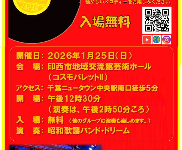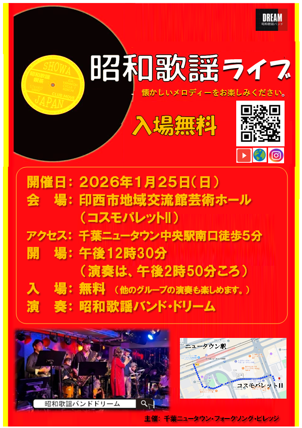 1月252026 昭和歌謡曲ライブ 2026新春 懐かしのサウンド 昭和歌謡曲ライブ 2026新春・第一弾ライブ 懐かしのサウンド~ 昭和歌謡曲を聴きながら、寒さを吹っ飛ばそう! 開催日:2026年1月25日(日) 会 場:印西市地域交流館芸術ホール コスモパレットII 開 場:午後12時30分(演奏は午後2時50分ころ) アクセス:北総線「千葉ニュータウン中央駅」南口から徒歩5分。 利用案内 住所:印西市中央南1丁目4番地3 電話:0476-33-6017 入場無料(他のグループの演奏もお楽しみ頂けます。) 演 奏:昭和歌謡バンド・ドリーム HP: https://dream-web-3.jimdosite.com/ Instagram: @DREAM_KAYOUKYOKU 予定曲: 美空ひばり、天地真理、加山雄三、ピンキーとキラーズ、GS、いしだあゆみ、その他。。。(演奏曲は変更する場合があります。) ご家族、お友達、お誘いの上、勿論、お一人でも、ウエルカムです。 皆様のご来場をお待ちしております。 日程2026-01-25 時間開場:午後12時30分 場所印西市中央南1丁目4番地3 印西市地域交流館芸術ホール コスモパレットII 地図 イベント名昭和歌謡曲ライブ 2026新春 懐かしのサウンド 主催者名千葉ニュータウン・フォークソングビレッジ 参加費無料 関連サイトURLhttps://dream-web-3.jimdosite.com/ 駐車場無し お問合わせ先 電話番号0476-33-6017 メールアドレスdream.kayoukyoku@gmail.com 備考※イベントの開催情報などは変更になる場合がありますので、事前にご確認の上お出掛けください。