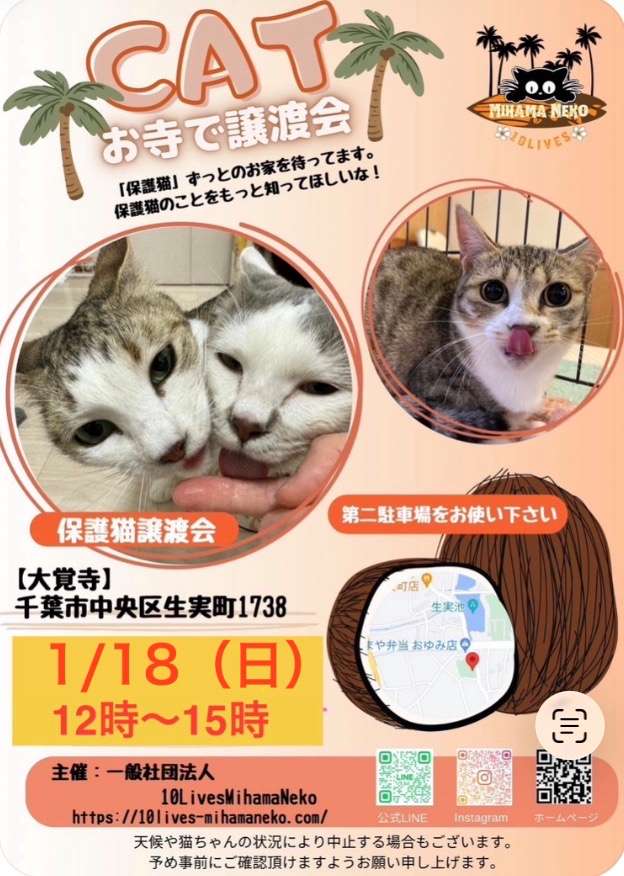 1月182026 保護猫の譲渡会-千葉市中央区 可愛い猫ちゃん達に会いに来て下さい 日程2026-01-18 時間12:00~15:00 場所千葉市中央区 生実町1738 大覚寺 地図 イベント名保護猫の譲渡会-千葉市中央区 主催者名みはまねこ 参加費無料 関連サイトURLhttps://10lives-mihamaneko.com/ 駐車場有り お問合わせ先 電話番号080-9050-2211 メールアドレス10lives.mihamaneko@gmail.com 備考※イベントの開催情報などは変更になる場合がありますので、事前にご確認の上お出掛けください。