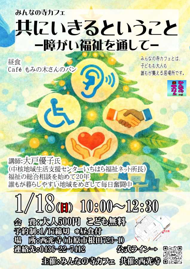 1月182026 みんなの寺カフェ 共に生きるということ-障がい福祉を通して- 1/17〆切 *忘れ物のお知らせ 12月の寺カフェで、XSサイズの黒いダウンジャケットの忘れ物がありました。 思い当たる方はお寺まで連絡をお願いいたします。 1月のみんなの寺カフェは「共に生きるということ-障がい福祉を通して-」と題しまして、いちはら福祉ネット所長大戸さんにお越しいただきお話をしていただきます。 昼食は事業のひとつ牛久駅前のもみの木さんのパンです。 日時:1/18(日) 10:00~12:30 内容:読経、講演、仏教紙芝居 会費:大人500円 こども(18歳未満)無料 予約制:1/17締切 昼食付 場所:西光寺(市原市根田723-1) 連絡先:0436-22-7412かこちらにメッセージか公式ラインにて https://lin.ee/YQ0gcIW 日程2026-01-18 時間10:00~12:30 場所市原市 根田 723-1 西光寺 地図 イベント名みんなの寺カフェ 共に生きるということ-障がい福祉を通して- 主催者名西光寺 参加費500円 関連サイトURLhttps://saikohji.net/ 駐車場有り お問合わせ先 電話番号0436-22-7412 メールアドレスsaikohji@saikohji.net 備考※イベントの開催情報などは変更になる場合がありますので、事前にご確認の上お出掛けください。