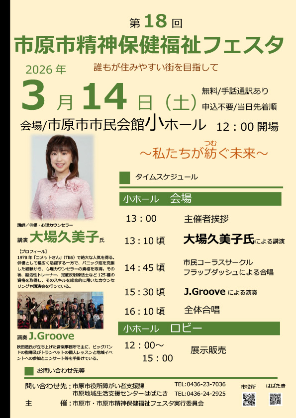 3月142026 第18回市原市精神保健福祉フェスタ 「市原市精神保健福祉フェスタ」は精神疾患及び精神障害に関する啓蒙啓発活動を目的とし今年度で18回目を迎えました。今年度のテーマは「私たちが紡ぐ未来」とし、大場久美子氏やビッグバンドJ.Grooveをお迎えし、精神障害を抱えた方々の地域生活及び共生社会の具現化に向けて開催をしたいと思っています。 日程2026-03-14 時間12:00~16:00 場所市原市 惣社 1-1-1 市原市市民会館小ホール 地図 イベント名第18回市原市精神保健福祉フェスタ 主催者名市原市・市原市精神保健福祉フェスタ実行委員 参加費無料 駐車場有り お問合わせ先 電話番号0436-22-7111 備考※イベントの開催情報などは変更になる場合がありますので、事前にご確認の上お出掛けください。
