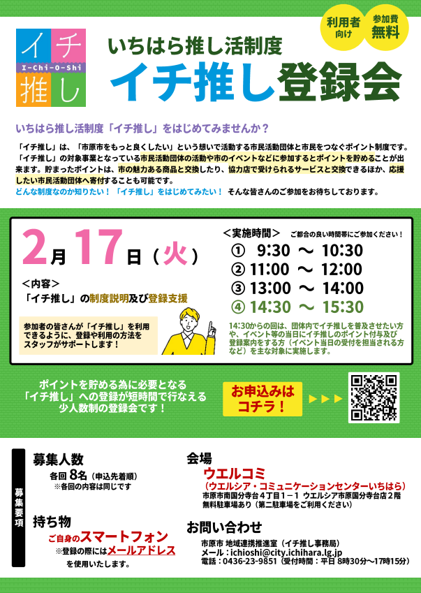 2月172026 イチ推し登録会 いちはら推し活制度(イチ推し)は、市原市を良くしたいという想いで活動する市民活動団体と市民をつなぐポイント制度です。市民活動団体の公益的な活動や市のイベントに参加してポイントを貯めると、応援したい団体に寄付できるほか、市の魅力商品や協力店でのサービスと交換できます。イチ推しを始めてみたい方を対象に、個人利用者向けの登録会を開催します。一人での登録に不安がある方など、ぜひお気軽にご参加ください。 時 間:①9:30~10:30 ②11:00~12:00 ③13:00~14:00 ④14:30~15:30 内 容:「イチ推し」の制度について説明し、登録までサクサク行う登録会です。 ①~③の内容は同じです。ご都合の良い時間帯にご参加ください。 ④のみ、団体内でイチ推しを普及したい方やポイントを付与する受付担当の方などを主な対象として実施します。 参加費:無料 定 員:各回8名(申込先着順) 持ち物:ご自身のスマートフォン ※登録の際には、メールアドレスを使用いたします。 申込方法:下記関連URLの申込フォームからお申込みください。 ※車でお越しの際は、第2駐車場をご利用ください。 日程2026-02-17 時間①9:30~ ②11:00~ ③13:00~ ④14:30~ 場所市原市 国分寺台中央 4-1-1 ウエルシア・コミュニケーションセンターいちはら(通称:ウエルコミ) ウエルシア市原国分寺台店2階 地図 イベント名イチ推し登録会 主催者名市原市地域連携推進室(イチ推し事務局) 参加費無料 関連サイトURLhttps://logoform.jp/form/bqJz/1343871 駐車場有り お問合わせ先 電話番号0436-23-9851 メールアドレスichioshi@city.ichihara.lg.jp 備考※イベントの開催情報などは変更になる場合がありますので、事前にご確認の上お出掛けください。