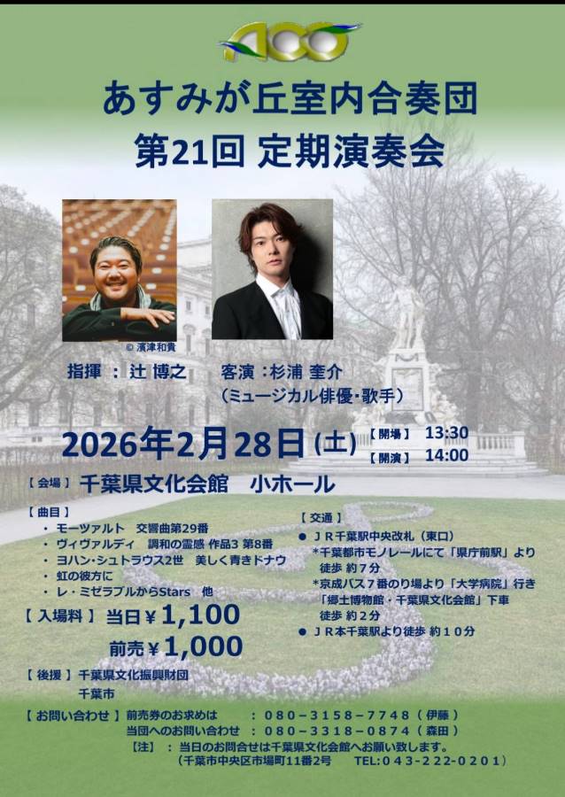 2月282026 あすみが丘室内合奏団「第21回定期演奏会」 地域の音楽好きが集まって結成された弦楽合奏団です。おかげさまで21回目の定期演奏会を迎えることができました。 演奏曲は、モーツアルト「交響曲第29番」や「美しく青きドナウ」など。 指揮:辻博之 また、ミュージカルなどで活躍中のテノール歌手:杉浦奎介氏をお招きし、歌唱も披露していただきます。 開催日:2月28日(土)13時30分開場、14時開演 開催場所:千葉県文化会館 小ホール 料金:1100円 皆様のご来場お待ちしております。 日程2026-02-28 時間14:00~16:00 場所千葉市中央区市場町 11-2 千葉県文化会館 小ホール 地図 イベント名あすみが丘室内合奏団「第21回定期演奏会」 主催者名あすみが丘室内合奏団 参加費1100円 関連サイトURLhttp://aco2000.web.fc2.com 駐車場有り お問合わせ先 電話番号080-3318-0874 メールアドレスmariko0874@gmail.com 備考※イベントの開催情報などは変更になる場合がありますので、事前にご確認の上お出掛けください。