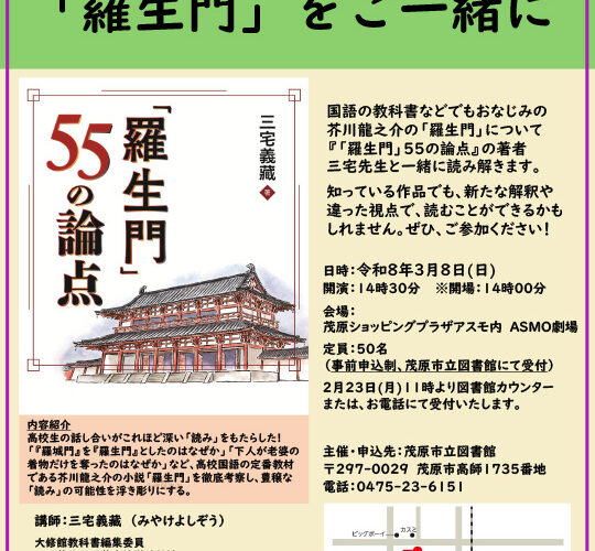 3月082026 文学講座『芥川龍之介の「羅生門」をご一緒に』 2/23~申込 3月8日(日)に令和7年度の講演会として 文学講座『芥川龍之介の「羅生門」をご一緒に』を開催します。 文学講座『芥川龍之介の「羅生門」をご一緒に』 日時:令和8年3月8日(日) 開演:14時30分 ※開場:14時 講師:三宅義藏(大修館書店教科書編集委員) 会場:茂原ショッピングプラザ アスモ内 ASMO劇場 定員:50名 参加無料、2月23日(月)11時から図書館カウンター お電話にて受付いたします。 国語の教科書でもおなじみの『羅生門』について、『「羅生門」55の論点』の著者三宅先生と一緒に、様々な視点で読み解きます。 ぜひ、ご参加ください! ※講演会当日は『羅生門』本文も配布予定です ※講演会終演後、講師の著作の販売会やサイン会も予定しております。 日程2026-03-08 時間14:30~16:00 場所茂原市 高師 1735 茂原ショッピングプラザアスモ2階 ASMO劇場 地図 イベント名文学講座『芥川龍之介の「羅生門」をご一緒に』 主催者名茂原市立図書館 参加費無料 関連サイトURLhttps://opac.library-mobara.jp/ 駐車場有り お問合わせ先 電話番号0475-23-6151 メールアドレスmobara4946@gmail.com 備考※イベントの開催情報などは変更になる場合がありますので、事前にご確認の上お出掛けください。