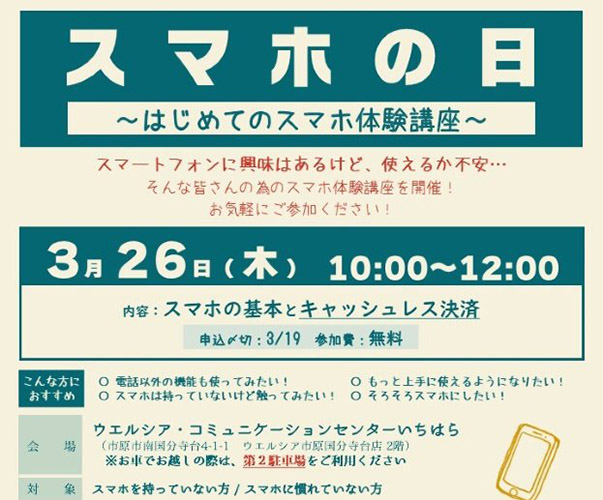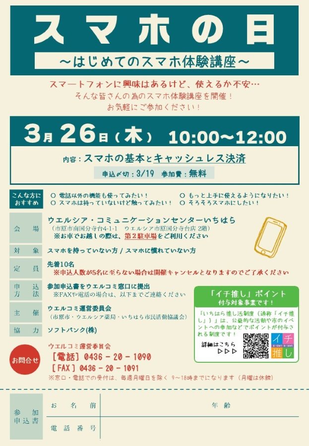 3月262026 気軽にスマホ体験!「スマホ体験講座」 3/19〆切 スマホに興味はあるけど、自分に使えるか心配で購入をためらっている方、スマホは持っているけど電話以外の機能は使ったことが無い方向けのスマホ教室です。 1人1台準備されたスマホで、インストラクターが丁寧に説明しながら実際に操作を行います。 テーマ:スマホの基本とキャッシュレス決済 巷で話題のキャッシュレスやQR決済って何?興味はあるけどよくわからない… ご安心ください!仕組み~便利でお得な使い方まで、一緒に楽しく学びましょう! スマホの基本も一緒に学べるので、はじめて触る方も安心して参加してください! 申込方法:3月19日(木)までに電話(ウエルコミ:0436-20-1090) ウエルコミ窓口又はFAX(0436-20-1091)で申込み ※ウエルコミ開館時間 9:00~18:00 (月曜休館) 車でお越しの際は第2駐車場をご利用ください。 日程2026-03-26 時間10:00~12:00 場所市原市 南国分寺台 4-1-1 ウエルシア・コミュニケーションセンターいちはら(通称:ウエルコミ) ウエルシア市原国分寺台店2階 地図 イベント名気軽にスマホ体験!「スマホ体験講座」 主催者名ウエルコミ(市原市・ウエルシア薬局・いちはら市民活動協議会) 参加費無料 関連サイトURLhttps://ichihara-machisapo.jp/0266/event/124.php 駐車場有り お問合わせ先 電話番号0436-20-1090 メールアドレスwelcommu.ichihara@gmail.com 備考※イベントの開催情報などは変更になる場合がありますので、事前にご確認の上お出掛けください。