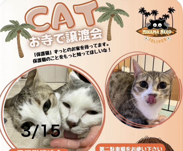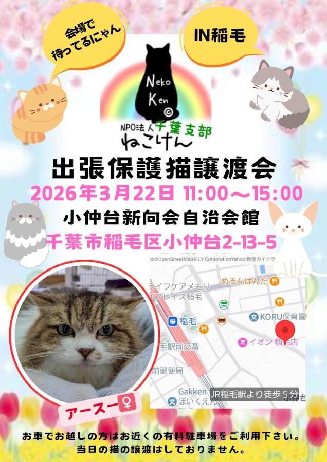 3月222026 保護猫の譲渡会-千葉市稲毛区 保護猫の譲渡会を開催します。子猫から大人猫までたくさん参加しています。 日程2026-03-22 時間11:00~15:00 場所千葉市稲毛区 小仲台 2-13-5 小仲台新向会自治会館 地図 イベント名保護猫の譲渡会-千葉市稲毛区 主催者名ねこけん千葉支部 参加費無料 関連サイトURLねこけん千葉支部OfficialBlog https://ameblo.jp/nekoken-chiba/ 駐車場無し お問合わせ先 メールアドレスchiba.info@nekoken.jp 備考※イベントの開催情報などは変更になる場合がありますので、事前にご確認の上お出掛けください。