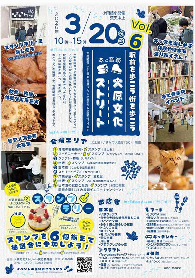 3月202026 大原文化ストリート 「駅前の通りで音楽が流れて、本があったらステキだな」そんな思いから始まりました。 駅前は発見のある場所であってほしい。 そんな駅前を歩こう・街を歩こう。 本とピアノを用意して、大原駅前でお待ちしています。 フードやクラフトの物販や体験・ワークショップ・スタンプラリーもございますので、気軽に遊びにいらしてください♪ 日程2026-03-20 時間10:00~15:00 場所いすみ市 大原8750 北土舎 周辺 地図 イベント名大原文化ストリート 主催者名大原文化ストリート実行委員会 参加費無料 関連サイトURLhttps://www.instagram.com/bunkastreet.oharaisumi?igsh=MWxybHRnZGlpemQzNw== 駐車場有り お問合わせ先 電話番号070-1390-3053 メールアドレスhokutosha.isumi@gmail.com 備考※イベントの開催情報などは変更になる場合がありますので、事前にご確認の上お出掛けください。