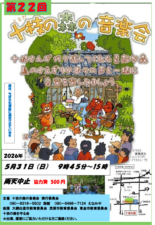 5月312026 第22回十枝の森の音楽会 千葉県の文化資産にも登録されている素敵な森の広場での音楽会です。 ジャズや昭和歌謡、ポップスなど多彩な音楽を楽しめます。 雨天中止 ☆出演、運営にご協力いただける方ご連絡ください。 日程2026-05-31 時間9:45~15:30 場所大網白里市 北吉田 758 十枝の森 地図 イベント名第22回十枝の森の音楽会 主催者名十枝の森の音楽会 実行委員会 参加費協力費 500円 駐車場有り お問合わせ先 電話番号09083185502 メールアドレスk.kuro.k947@gmail.com 備考※イベントの開催情報などは変更になる場合がありますので、事前にご確認の上お出掛けください。