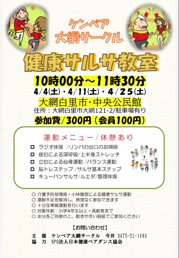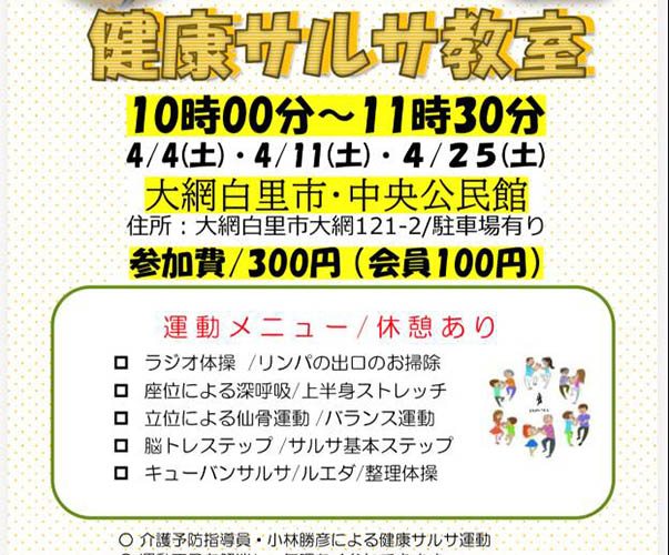 4月252026 健康サルサ教室 4/4・11・25 「楽しい」は最強の処方箋!今話題の「健康サルサ」で心も体もリフレッシュ一人で黙々と歩くよりも、誰かと手を取り合って笑うことこそが、最高の健康法です 。 大網白里市で活動する「ケンペア大網サークル」では、初心者の方でも安心して楽しめるキューバスタイルのサルサダンス教室を開催中。 座ったままのストレッチから、脳を活性化させるステップまで、音楽に乗って無理なく身体を動かします 。 「最近、笑う機会が減ったな」「いつまでも元気に歩きたい」という方、ぜひ一度体験してみませんか? 水分をご持参の上、動きやすい服装でご参加ください。 日時: 4/4・11・25(土) 10:00?11:30 会場: 大網白里市・中央公民館(駐車場あり) 参加費: 300円(会員100円) 講師: 小林勝彦(介護予防指導員・音楽家) 日程2026- 4/4・11・25(土) 時間10:00~11:30 場所大網白里市 大網 121番地2 大網白里市・中央公民館 地図 イベント名健康サルサ教室 主催者名NPO法人日本健康ペアダンス協会 参加費300円 関連サイトURLhttps://www.kenko-pairdance.com/ 駐車場有り お問合わせ先 電話番号0475-51-1493 メールアドレスinfo@kenko-pairdance.com 備考※イベントの開催情報などは変更になる場合がありますので、事前にご確認の上お出掛けください。