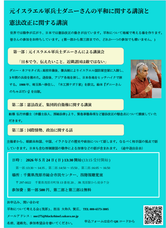 5月242026 元イスラエル軍兵士の平和に関する講演と 憲法改正に関する講演 第一部:元イスラエル軍兵士ダニーさんによる平和に関する講演会 第二部:弁護士より憲法改正に関する講演 日程2026-05-24 時間13:30~16:50 場所茂原市 町保13番地20 茂原市総合市民センター、四階視聴覚室 地図 イベント名元イスラエル軍兵士の平和に関する講演と 憲法改正に関する講演 主催者名平和について考える会(茂原) 参加費500円 関連サイトURLhttps://form.run/@nor–Z9yFX7tgGAhfwkiJ6y7X 駐車場有り お問合わせ先 電話番号080-6573-3805 メールアドレスnor275@blackrhino5.sakura.ne.jp 備考※イベントの開催情報などは変更になる場合がありますので、事前にご確認の上お出掛けください。