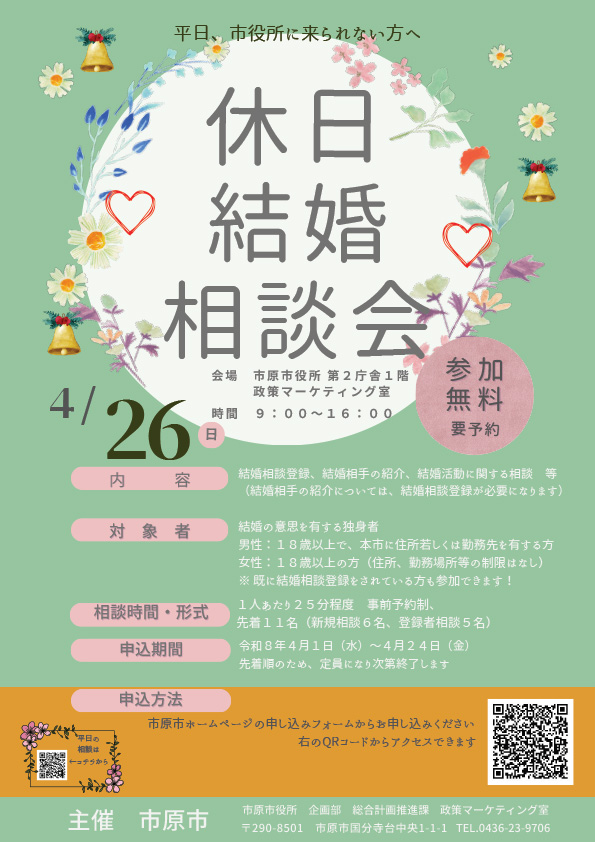 4月262026 休日結婚相談会を開催します 4/24〆切 4月26日(日)、結婚を希望する方を対象に「休日結婚相談会」を開催します。 結婚相談員から相談者の状況に応じたアドバイスなどを無料で受けることができますので、ぜひ、ご参加ください。 なお、結婚相手の紹介については、市の結婚相談への登録が必要となります。 日程2026-04-26 時間9:00~16:00 場所市原市 国分寺台中央1-1-1 市原市役所・政策マーケティング室 地図 イベント名休日結婚相談会を開催します 主催者名市原市(政策マーケティング室) 参加費無料 関連サイトURLhttps://www.city.ichihara.chiba.jp/article?articleId=661899d4a402c0327ef950ec 駐車場有り お問合わせ先 電話番号0436-23-9706 メールアドレスseisaku-m@city.ichihara.lg.jp 備考※イベントの開催情報などは変更になる場合がありますので、事前にご確認の上お出掛けください。