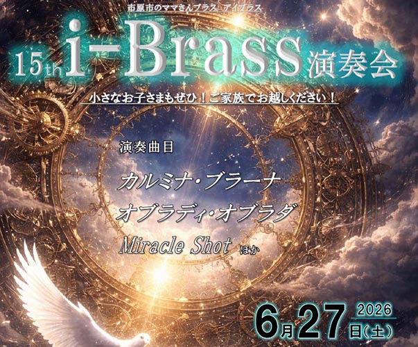 6月272026 i-Brass 第15回 演奏会 ママさん吹奏楽団 i-Brassの第15回演奏会です。 童謡、ディズニー、オールディーズと幅広く演奏します。お子様連れでどうぞ。 日程2026-06-27 時間13:30~ 場所市原市 惣社 1-1-1 市原市市民会館小ホール 地図 イベント名i-Brass 第15回 演奏会 主催者名i-Brass 参加費無料 関連サイトURLhttp://ibrass.web.fc2.com/ 駐車場有り お問合わせ先 電話番号090-8779-0005 メールアドレスinfo.ibrass@gmail.com 備考※イベントの開催情報などは変更になる場合がありますので、事前にご確認の上お出掛けください。