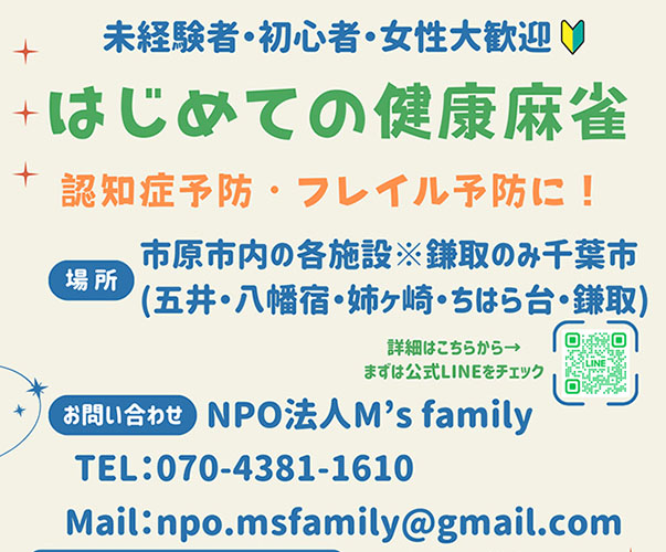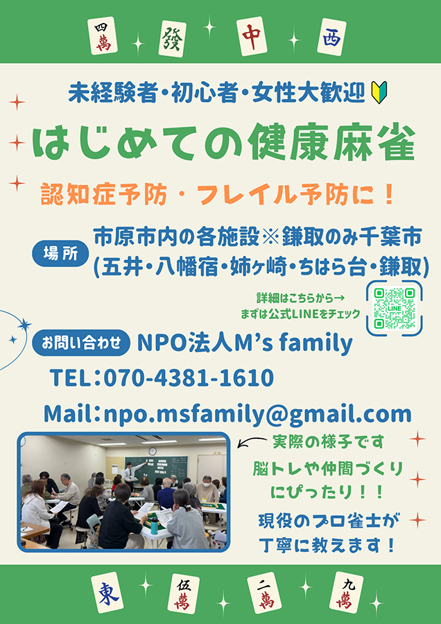 市原市を拠点として市内各地で、「卓を囲めば、みんな家族」をモットーに健康麻雀教室を開催しています!