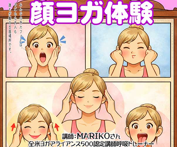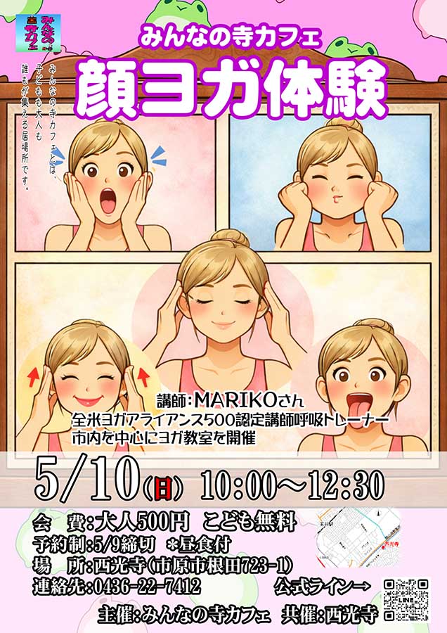 5月102026 みんなの寺カフェ 顔ヨガ体験 5/9〆切 西光寺ヨガでもお世話になっているMARIKO先生に、認知症や脳梗塞予防になる顔ヨガを教えていただきます。 日時:5/10(日) 10:00~12:30 内容:読経、顔ヨガ、仏教紙芝居 会費:大人500円 こども(18歳未満)無料 予約制:5/9締切 昼食付 場所:西光寺(市原市根田723-1) 連絡先:0436-22-7412かこちらにメッセージ 日程2026-05-10 時間10:00~12:30 場所市原市 根田 723-1 西光寺 地図 イベント名みんなの寺カフェ 顔ヨガ体験 主催者名西光寺 参加費500円 関連サイトURLhttps://saikohji.net/ 駐車場有り お問合わせ先 電話番号0436-22-7412 メールアドレスsaikohji@saikohji.net 備考※イベントの開催情報などは変更になる場合がありますので、事前にご確認の上お出掛けください。