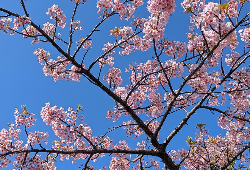 桜前線のソメイヨシノより早く咲く、濃いピンクの河津桜。